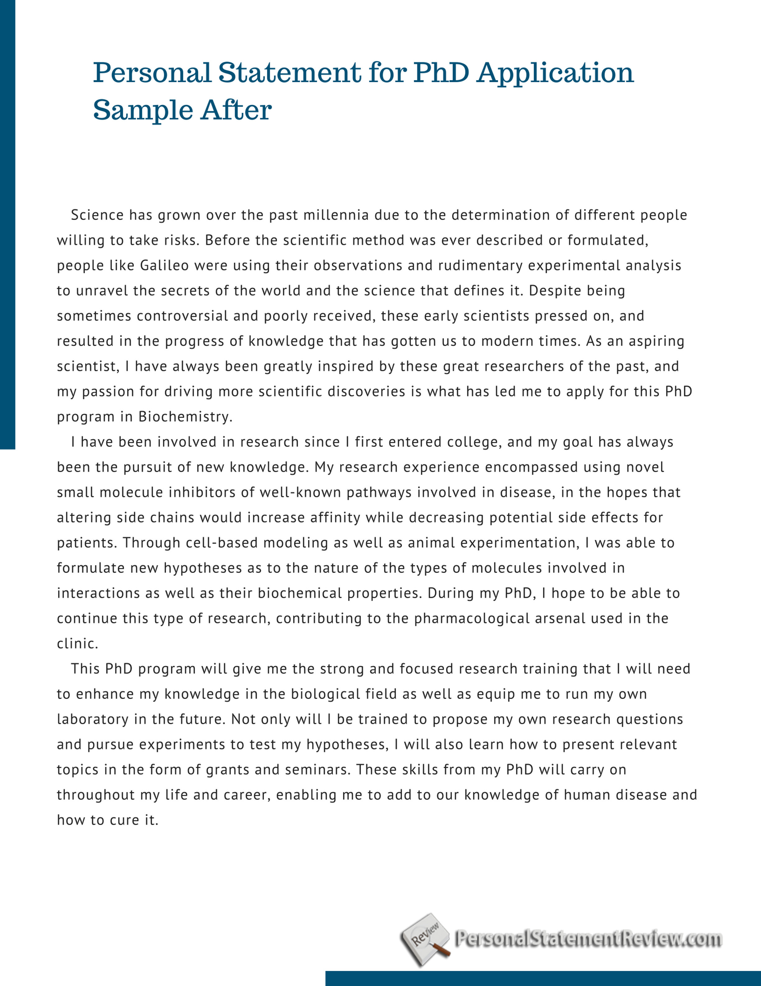Most students applying to Ph.D. programs are able to quickly write short essays, so you may be tempted to assume that you’ll also be able to write your personal statement without devoting too much time or effort to this process. Although personal statements are short, they’ll require more time than you might expect PhD Personal Statement Example. I would like to pursue a Doctoral Degree in Child and Family Development from the University of Georgia. I am currently obtaining a masters degree in Gerontology at Miami University of Ohio and I believe that looking at the older population in a family context gives a detailed insight into individuals’ lives and that · Personal Statement for a Ph.D. in Literature In August , I completed my graduate degree and thesis for the Research Master's in Comparative Literary Studies at [university name2]